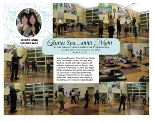 The invitation affectionately said “This event is open to all mothers, daughters, sisters, aunties, grandmothers, cousins…basically all the ladies in our SHCP community including staff, faculty and past alumni for an evening of pampering.” I gave a lecture/demo on Tai Chi while my daughter Chelsea taught Yoga. Yes, it’s all in the family. Chelsea has joined me in perpetuating her grandfather Tai Chi Master Peng’s mission to promote health. Dozens of pampered ladies listened and learned about the Asian exercises. They had so much fun, they didn’t even realize they were exercising! It doesn’t have to be grunt work. Try it, you’ll like it. For information on how you can arrange lecture/demo contact me.